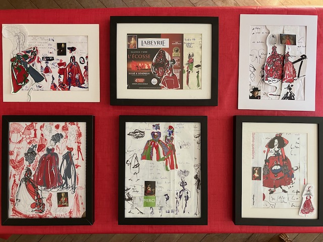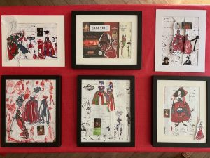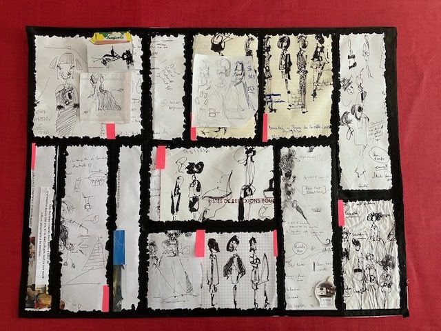 Collages issus de notes personnelles, agendas, et rapports professionnels, envahis d’écritures automatiques de reines, de robes, de coiffures, et de rubans